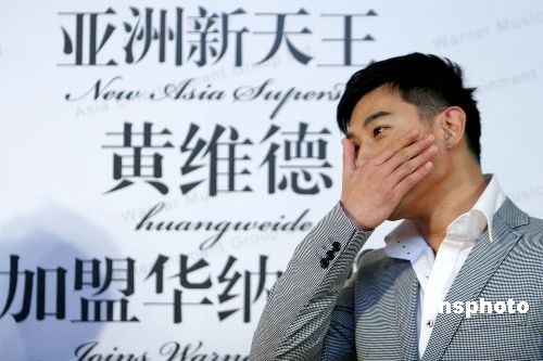 2009年3月9日,臺灣影視紅星黃維德加盟華納唱片簽約發(fā)布會在北京隆重舉行。蔡依林恩師陳澤杉送上繡有“金榜題名”的卷軸。事逢前日伊能靜博客突發(fā)感言表明已和庾澄慶離婚,使?fàn)渴珠T中的主角黃維德再次被推上風(fēng)口浪尖。發(fā)布會中黃維德感嘆生活多揣,看到依舊堅定支持的歌迷突然落淚、抽咽。隨后的媒體訪問在問題逐漸深入的過程中黃維德最終難再支撐,匆匆離去。中新社發(fā) 袁方 攝