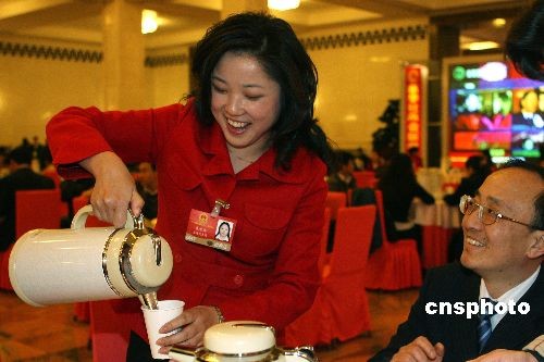 3月10日下午,十一屆全國人大二次會議在北京人民大會堂舉行第三次全體大會,聽取最高人民法院和最高人民檢察院的工作報告。會前,上海代表團(tuán)的打工妹代表朱雪芹臨時“改行”,熱情地為其他代表沏茶倒水。中新社發(fā) 任晨鳴 攝