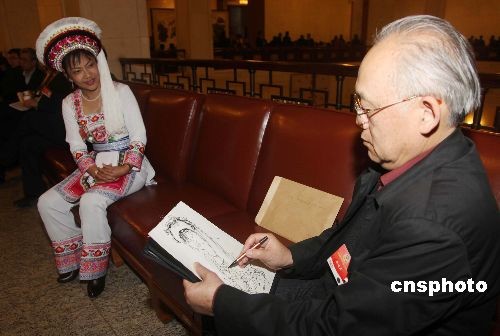 3月10日下午,十一屆全國(guó)人大會(huì)二次會(huì)議在人民大會(huì)堂舉行第三次全體大會(huì)。列席會(huì)議的全國(guó)政協(xié)委員李延聲在會(huì)前為少數(shù)民族代表畫(huà)速寫(xiě)。中新社發(fā) 張婭子 攝