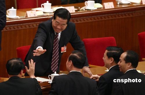 3月10日,全國(guó)政協(xié)主席賈慶林在十一屆全國(guó)人大會(huì)二次會(huì)議第三次全體會(huì)議結(jié)束后和代表握手。中新社發(fā) 杜洋 攝