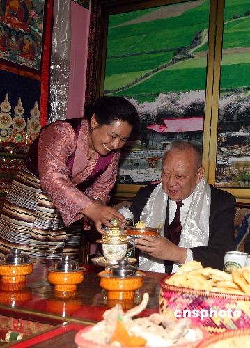 3月11日,參加“兩會(huì)”的全國政協(xié)副主席董建華,前往北京民族文化宮參觀“西藏民主改革50年展覽”。圖為董建華在參觀時(shí)感受藏族民俗。中新社發(fā) 張宇 攝