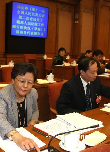 3月12日上午,十一屆全國人大二次會議第三次主席團(tuán)會議在北京人民大會堂舉行。會議經(jīng)過表決,決定將關(guān)于全國人大常委會工作報(bào)告的決議草案、關(guān)于最高人民法院工作報(bào)告的決議草案、關(guān)于最高人民檢察院工作報(bào)告的決議草案提請各代表團(tuán)審議。圖為主席團(tuán)成員范徐麗泰按表決器。中新社發(fā) 任晨鳴 攝
