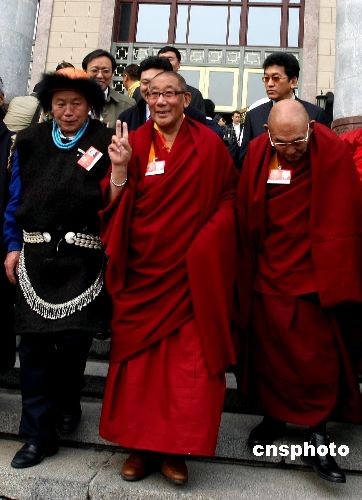 3月12日,全國政協(xié)十一屆二次會議閉幕。圖為來自西藏的宗教界委員阿旺吉卓(中)走出會場。中新社發(fā) 傅丹丹 攝
