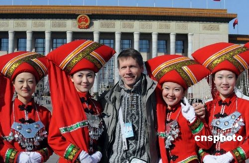 3月12日,在北京人民大會(huì)堂前,一名外國(guó)記者與為“兩會(huì)”服務(wù)的工作人員合影留念。中新社發(fā) 于潤(rùn)杰 攝