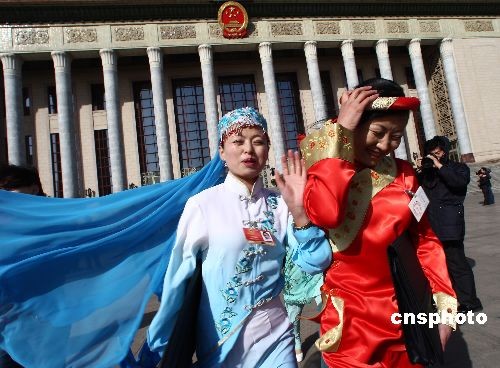 3月13日,第十一屆全國人民代表大會第二次會議在人民大會堂閉幕,少數(shù)民族代表在盎然的春風(fēng)中步出人民大會堂。中新社發(fā) 杜洋 攝