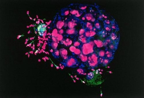 人類胚胎和精子:這張色彩艷麗的美麗圖片,是利用共聚焦顯微鏡拍攝的。胚胎和精細(xì)胞核呈紫色,而精子的尾巴是綠色。藍(lán)色區(qū)域是縫隙連接(gap junction),它們把細(xì)胞彼此聯(lián)系在一起。