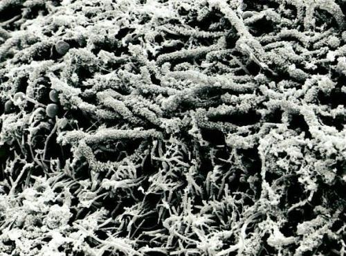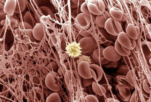 血液凝塊:這張圖看起來像是紅血球粘在了粘性網(wǎng)上,形成血液凝塊。位于中間的那個(gè)細(xì)胞是白血球。