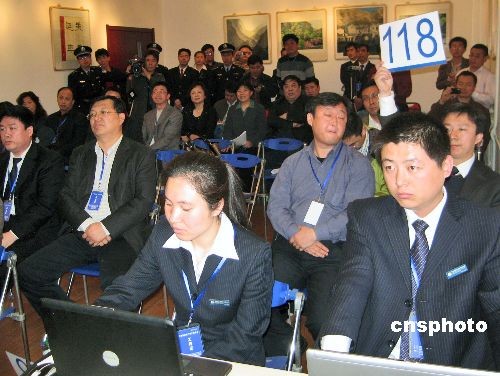 4月9日,河北省嘉海拍賣有限公司作為主拍單位,與河北省東方拍賣有限公司、河北省拍賣總行有限公司共同對三鹿集團(tuán)部分破產(chǎn)資產(chǎn)進(jìn)行拍賣。面對拍賣的三鹿集團(tuán)(山東)乳業(yè)有限公司95%股權(quán),四家公司輪番叫價(jià)毫不放松,競爭激烈。北京三元集團(tuán)最終以4900萬人民幣競買成功。圖為北京三元集團(tuán)舉牌(118號)叫價(jià)。中新社發(fā) 翟羽佳 攝
