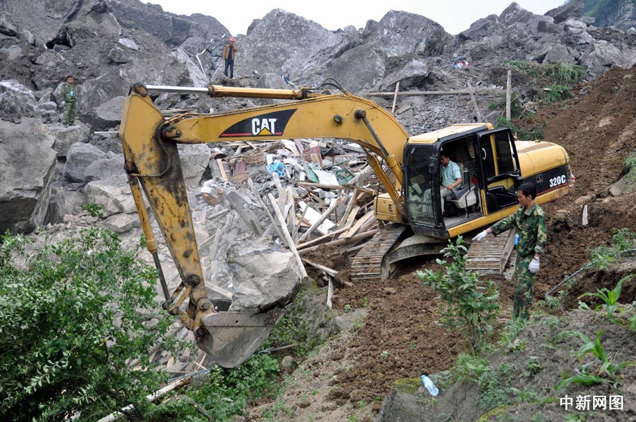 因垮塌的民房為兩層樓混泥土結(jié)構(gòu),且上有土石堆積,只攜帶了簡易救援工具的救援官兵難以快速搜救被埋者。6月7日15時許,第一臺型號為CAT320C的中型挖掘機(jī)駛進(jìn)垮塌現(xiàn)場進(jìn)行挖掘作業(yè)。 曹多然 攝