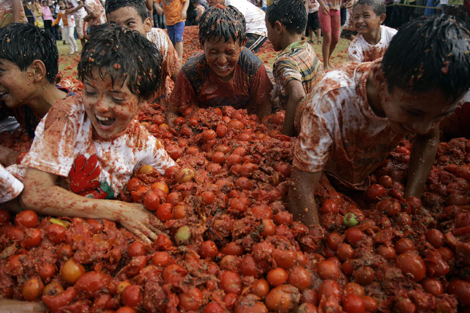 2009年6月14日,哥倫比亞第五屆番茄狂歡節(jié)開幕,參與者互相投擲西紅柿,盡情狂歡慶豐收。來自哥倫比亞各地的狂歡者們云集在首都波哥大東北部的蘇塔馬錢小鎮(zhèn),街道上立刻變成了西紅柿紛飛的戰(zhàn)場。雖然每個人的臉上身上沾滿了西紅柿汁,但人們還是樂此不疲又是丟又是砸,把成堆的西紅柿當(dāng)成打仗的“武器”。還有人特地穿上白衣白褲,身上越紅,心里就越痛快。