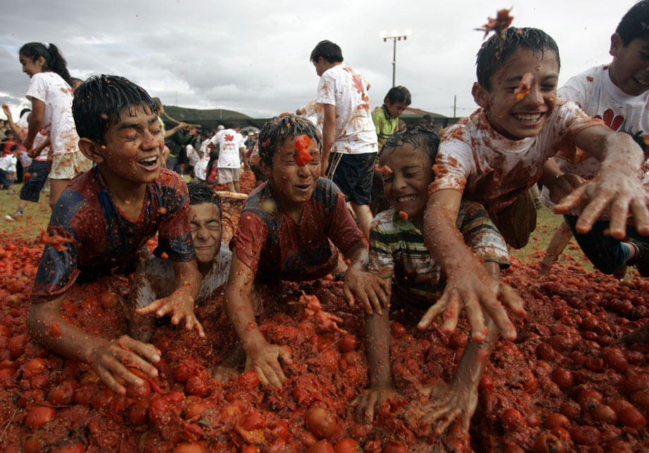2009年6月14日,哥倫比亞第五屆番茄狂歡節(jié)開(kāi)幕,參與者互相投擲西紅柿,盡情狂歡慶豐收。來(lái)自哥倫比亞各地的狂歡者們?cè)萍谑锥疾ǜ绱髺|北部的蘇塔馬錢(qián)小鎮(zhèn),街道上立刻變成了西紅柿紛飛的戰(zhàn)場(chǎng)。雖然每個(gè)人的臉上身上沾滿(mǎn)了西紅柿汁,但人們還是樂(lè)此不疲又是丟又是砸,把成堆的西紅柿當(dāng)成打仗的“武器”。還有人特地穿上白衣白褲,身上越紅,心里就越痛快。