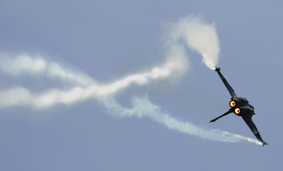 圖為法國陣風(fēng)戰(zhàn)斗機進行飛行表演。