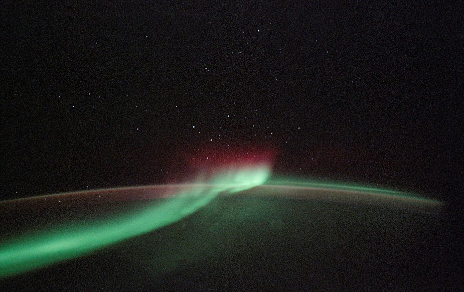 在兩極上空大氣層以上數(shù)十公里的太空,極光現(xiàn)象仍能被清楚地觀測(cè)到。紅色、綠色的極光閃爍著怪異的微弱綠光,好似鬼怪之光,給人以寒冷的感覺。在繞地軌道上的宇航員用長曝光相機(jī)和35毫米膠片拍攝下了這些怪異的圖片。