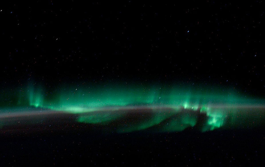 在兩極上空大氣層以上數(shù)十公里的太空,極光現(xiàn)象仍能被清楚地觀測到。紅色、綠色的極光閃爍著怪異的微弱綠光,好似鬼怪之光,給人以寒冷的感覺。在繞地軌道上的宇航員用長曝光相機和35毫米膠片拍攝下了這些怪異的圖片。