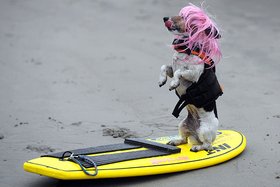 6月20日,在美國(guó)加利福尼亞州帝國(guó)沙灘舉行了一場(chǎng)小狗沖浪比賽,小狗們表現(xiàn)得十分認(rèn)真。
