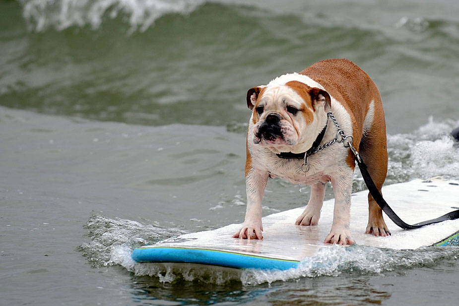 6月20日,在美國加利福尼亞州帝國沙灘舉行了一場小狗沖浪比賽,小狗們表現(xiàn)得十分認(rèn)真。