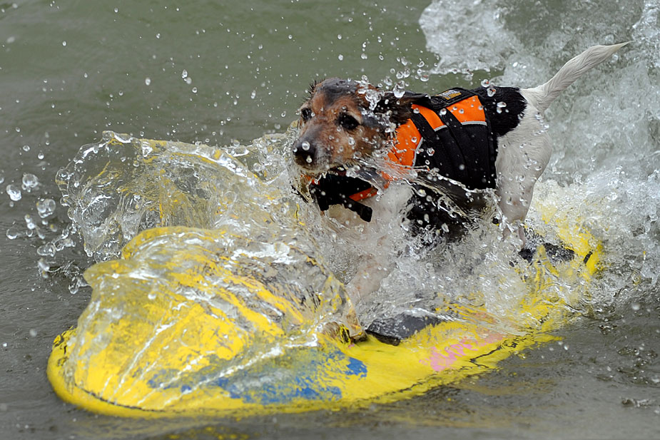 6月20日,在美國加利福尼亞州帝國沙灘舉行了一場小狗沖浪比賽,小狗們表現(xiàn)得十分認(rèn)真。