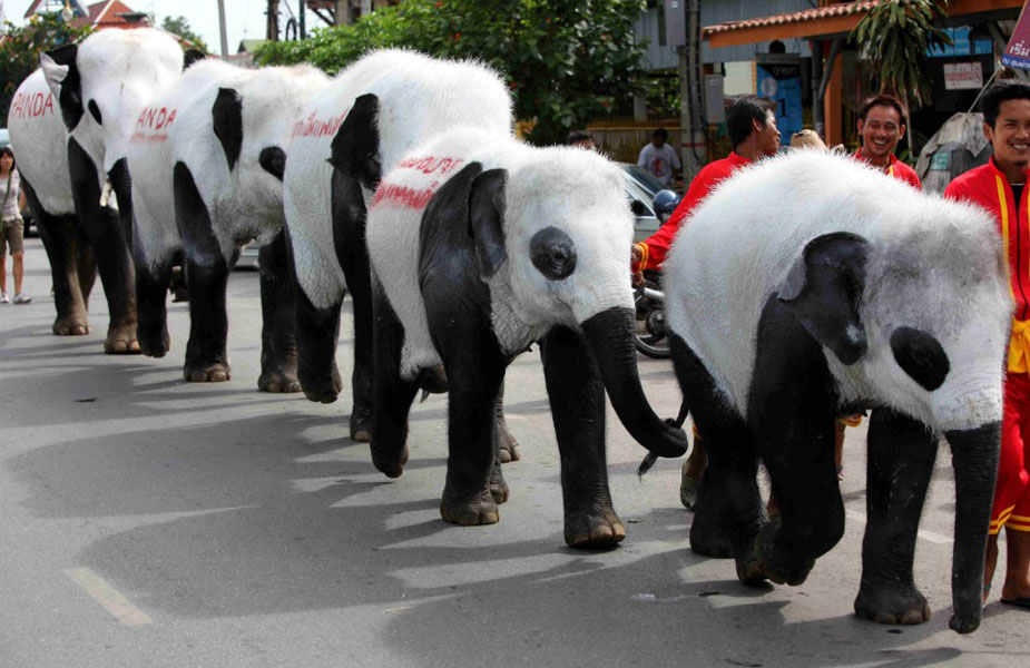 6月26日,泰國曼谷以北的大城府,被繪成熊貓模樣的大象在街頭行進。