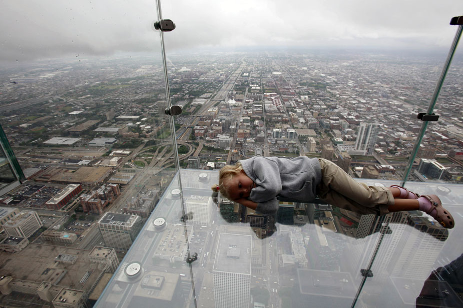 7月1日,美國芝加哥,西爾斯大廈在第103層瞭望臺(tái)增設(shè)的玻璃陽臺(tái)對(duì)媒體開放。這些玻璃陽臺(tái)建在大廈西側(cè),從瞭望臺(tái)向外延伸約1.2米。陽臺(tái)的玻璃地板厚達(dá)12.7厘米,可承重約5噸。