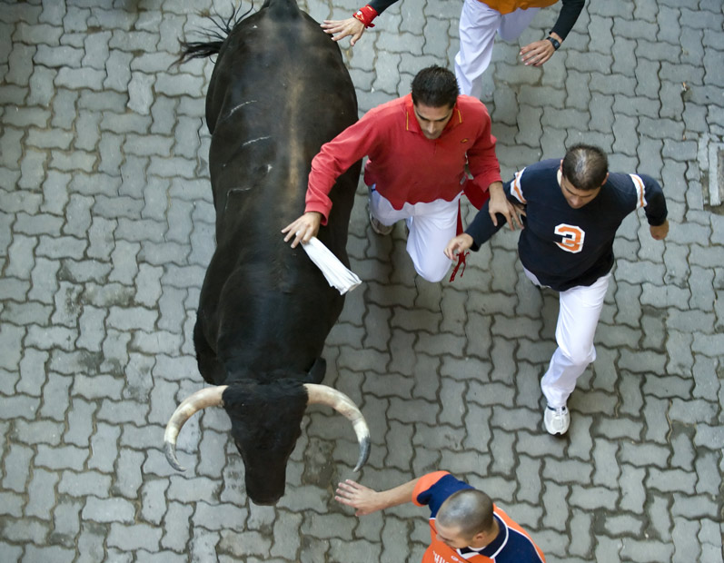 西班牙一年一度的潘普洛納奔牛節(jié)上驚險場面層出不窮。奔牛節(jié)是潘普洛納的傳統(tǒng)節(jié)日,其歷史可以追溯到1591年,每年都吸引數(shù)十萬人參加。