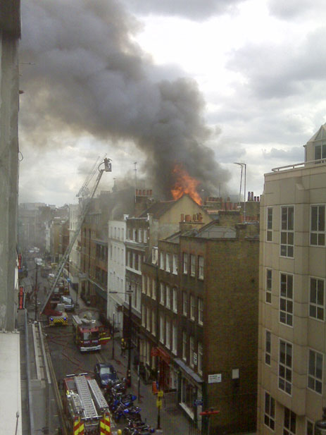 英國倫敦中部蘇豪區(qū)在當?shù)貢r間10日下午2時左右發(fā)生火警,起火的5層高商業(yè)樓宇被嚴重焚毀,現(xiàn)場冒出大量濃煙,在倫敦市內(nèi)多處均清楚可見。消防部門派出12輛消防車及60名消防員進行灌救。