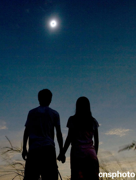 2009年7月22日9時(shí)23分,一對(duì)情侶在湖北省潛江市觀看日全食。 中新社發(fā) 程欣 攝