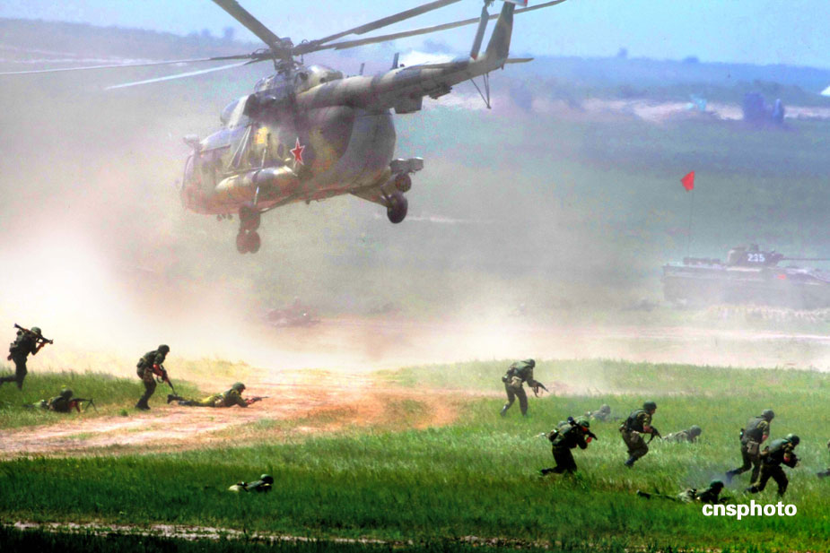 中國、俄羅斯兩軍總參謀長,7月23日上午到沈陽軍區(qū)洮南合同戰(zhàn)術(shù)訓(xùn)練基地,觀看“和平使命2009”聯(lián)合反恐軍事演習(xí)。雙方以陸軍和空軍為主,中方參演部隊包括1個陸軍戰(zhàn)斗群和1個空軍戰(zhàn)斗群。俄方參演兵力包括1個陸軍加強摩步營、1個空降突擊連和部分空軍兵力,雙方投入兵力兩千多人。中新社發(fā) 宋吉河 攝