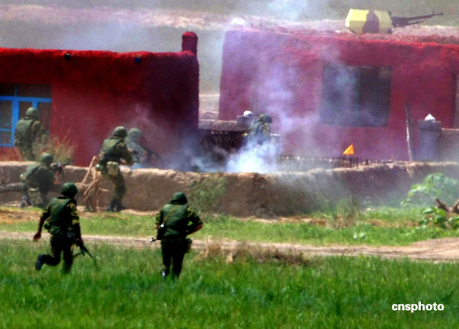 中國、俄羅斯兩軍總參謀長,7月23日上午到沈陽軍區(qū)洮南合同戰(zhàn)術訓練基地,觀看“和平使命2009”聯(lián)合反恐軍事演習。雙方以陸軍和空軍為主,中方參演部隊包括1個陸軍戰(zhàn)斗群和1個空軍戰(zhàn)斗群。俄方參演兵力包括1個陸軍加強摩步營、1個空降突擊連和部分空軍兵力,雙方投入兵力兩千多人。中新社發(fā) 宋吉河 攝