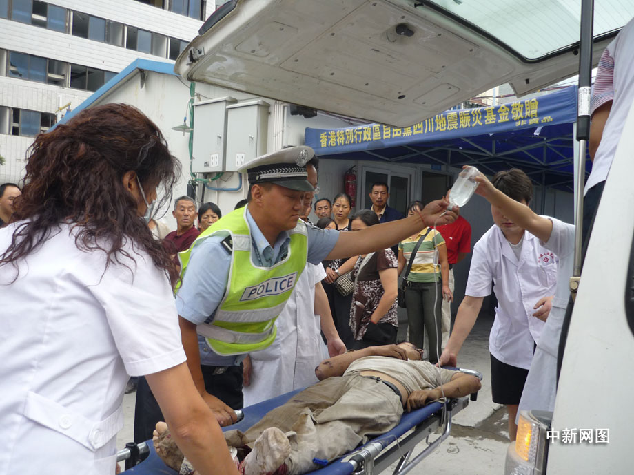 25日凌晨四點鐘左右,汶川縣境內(nèi)國道二一三線徹底關(guān)大橋被山上飛下來的巨石砸斷,已造成100米的橋面坍塌,7輛汽車受損,12人不同程度受傷,3人死亡,都汶路通行中斷。圖為汶川縣人民醫(yī)院正在積極搶救傷員。 汶新 攝