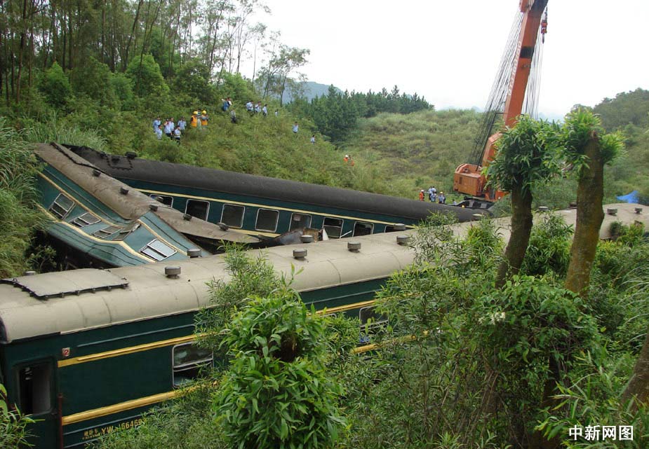 2009年7月29日4時22分,由襄樊開往湛江的1473次旅客列車運(yùn)行至焦柳線廣西境內(nèi)古砦至寨隆間,因連日持續(xù)強(qiáng)降雨造成山體崩塌掩埋線路,列車機(jī)車及機(jī)后1-4位車輛脫軌,造成4名旅客死亡,50余名旅客受傷,焦柳線中斷行車。廖承果 攝