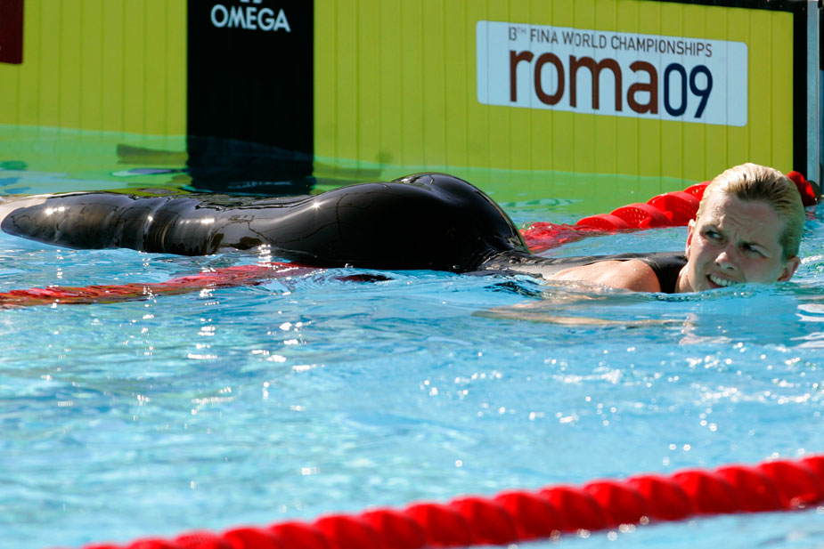 “有腳的美人魚(yú)”——7月30日,布麗塔·斯特芬在女子100米自由泳預(yù)賽后橫跨泳道線秀美臀。