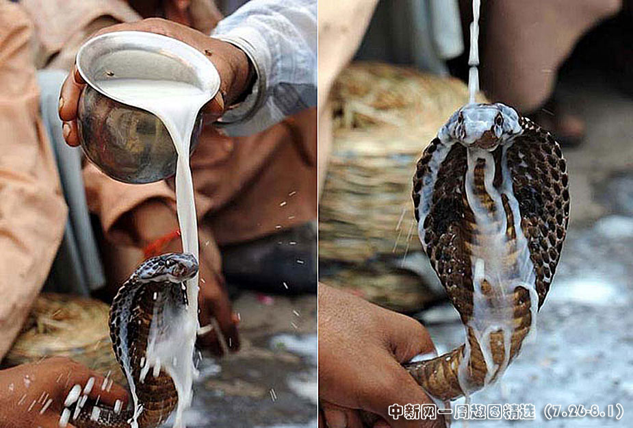 7月26日,印度北部城市阿姆利則一座印度教神廟內(nèi),耍蛇人將眼鏡蛇浸入牛奶中。點擊觀看詳細內(nèi)容