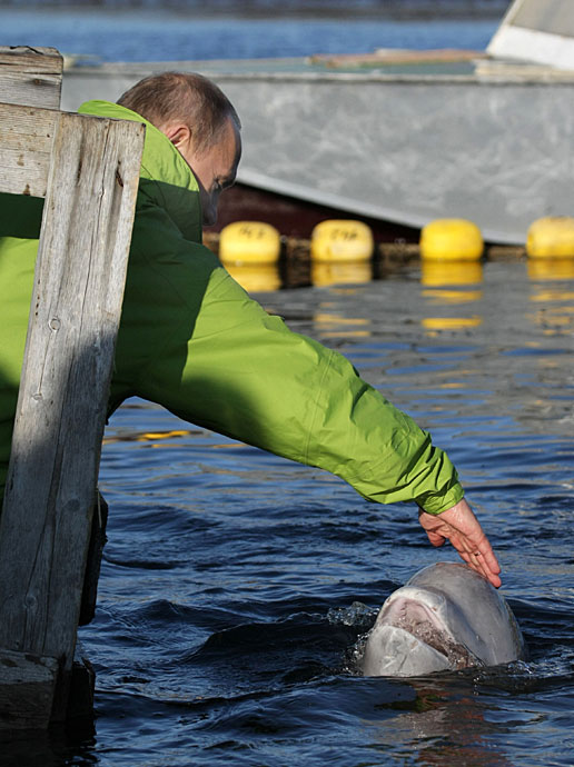 俄羅斯總理普京7月31日在太平洋的契卡洛夫島為一條白鯨裝上衛(wèi)星追蹤器。其后他更幫手喂其他白鯨魚吃。