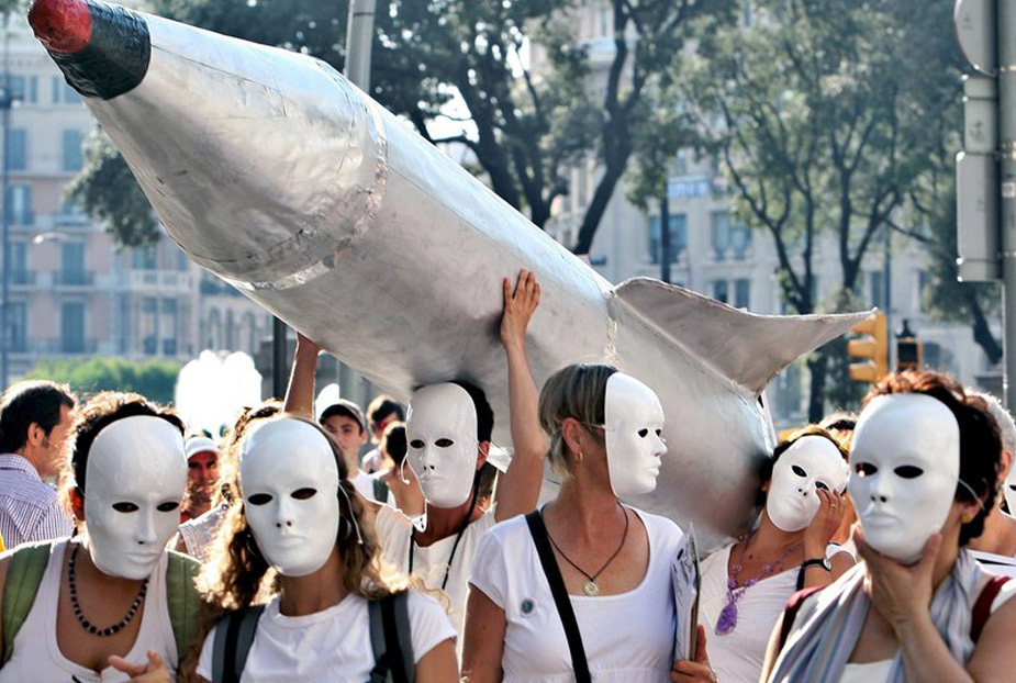 西班牙巴塞羅那,人們帶著面具舉行集會,紀(jì)念日本廣島遭原子彈轟炸64周年。
