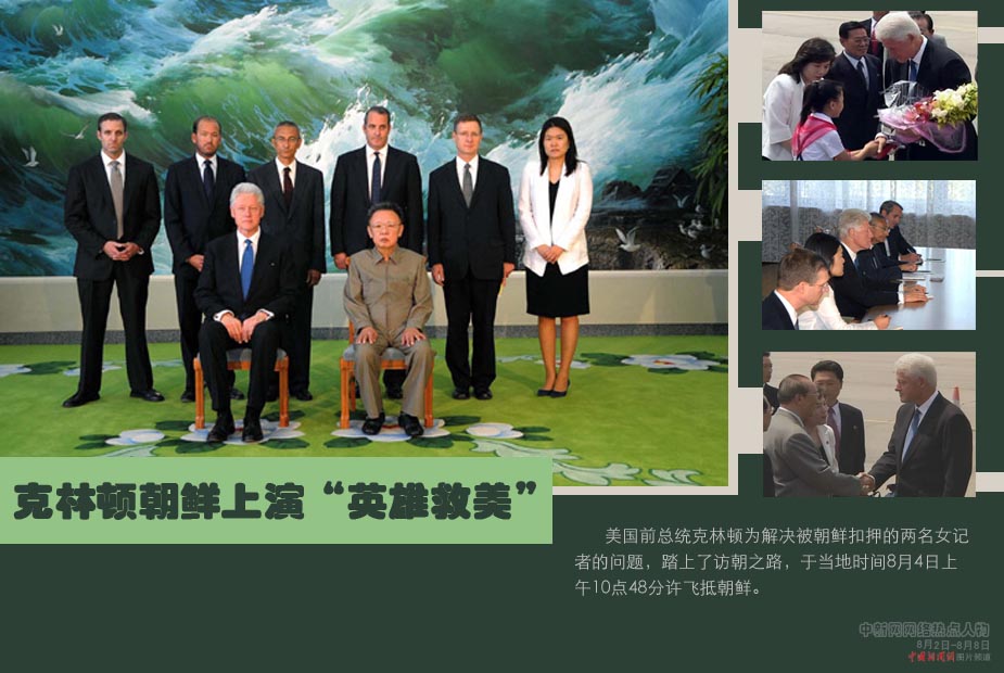 中新網(wǎng)本周熱點人物之克林頓——8月6日,美國前總統(tǒng)克林頓在平壤斡旋成功,朝鮮領(lǐng)導(dǎo)人金正日下令特赦在押的兩名美國女記者。三十二歲的凌志美、三十六歲的李承恩(前譯李尤娜)與克林頓所乘坐的飛機(jī)在洛杉磯附近的伯班克機(jī)場降落,兩名女記者下機(jī)時,與家人團(tuán)聚激動得泣不成聲。
