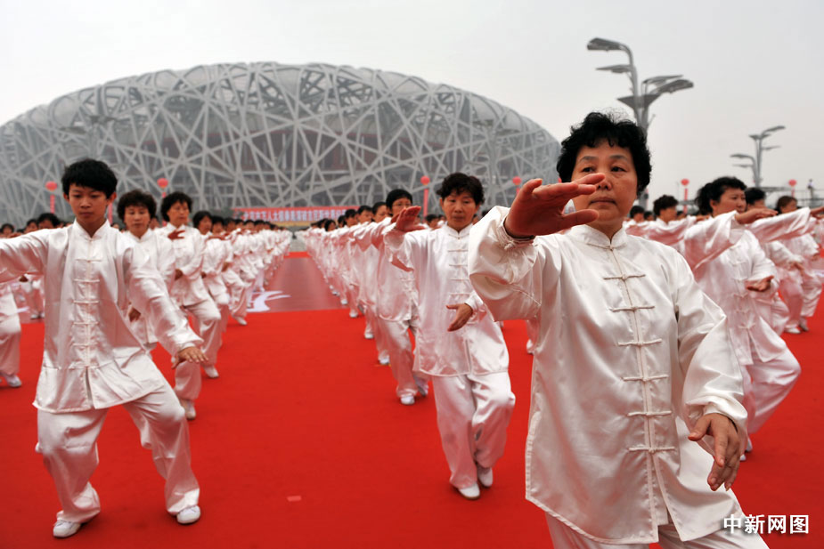 8月8日,全國首個“全民健身日”北京主會場啟動儀式上,三萬多群眾進行太極拳展示活動,在世界吉尼斯總部認證官員的見證下成功打破世界紀錄。 中新網(wǎng)記者 金碩 攝