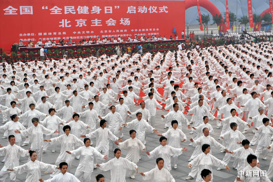 8月8日,全國首個“全民健身日”北京主會場啟動儀式上,三萬多群眾進行太極拳展示活動,在世界吉尼斯總部認(rèn)證官員的見證下成功打破世界紀(jì)錄。中新網(wǎng)記者 金碩 攝