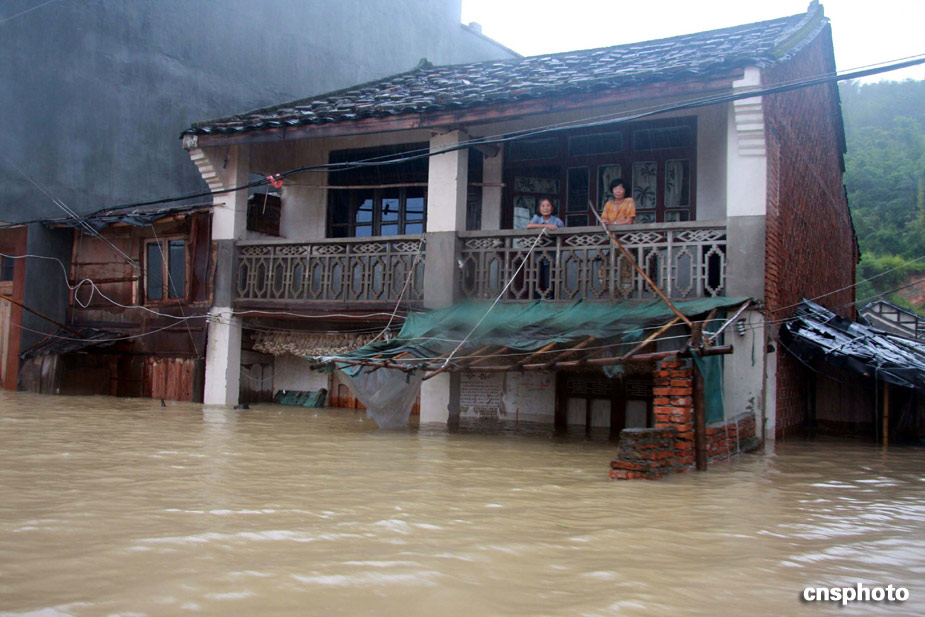 八月九日,受臺(tái)風(fēng)“莫拉克”強(qiáng)降雨的影響,福建寧德福鼎南墘村大面積受淹,大水同時(shí)也將通往該村的道路全部淹沒,致使該村猶如“孤島”,該村近三百名村民被困。中新社發(fā) 彭登筍 攝