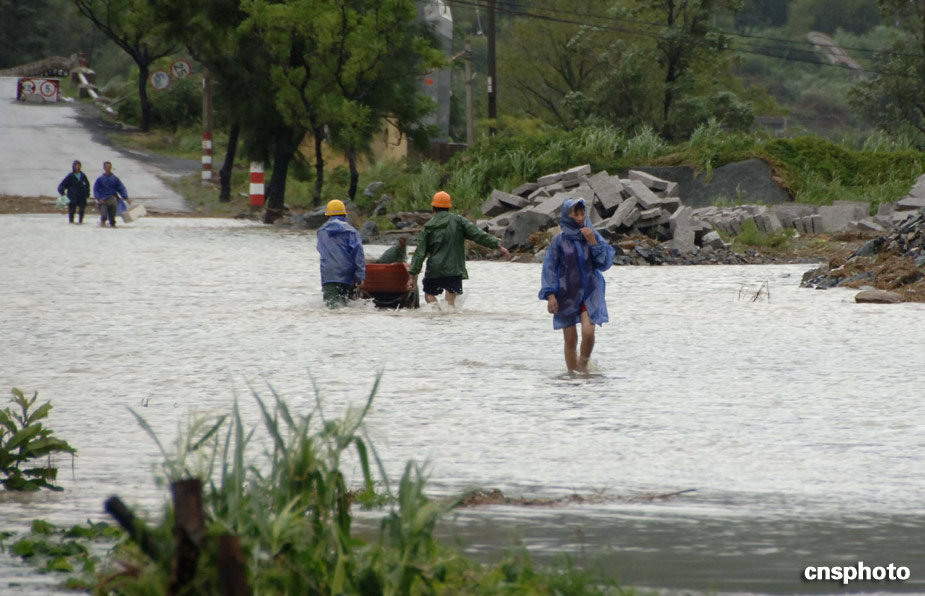 8月9日16時20分,第8號臺風(fēng)“莫拉克”在福建省霞浦縣沿海登陸,登陸時臺風(fēng)中心最大風(fēng)速12級(33米/秒),中心氣壓970百帕!澳恕睅淼膹娊涤曛率垢=ㄏ计衷S多路段被淹。中新社發(fā) 王東明 攝