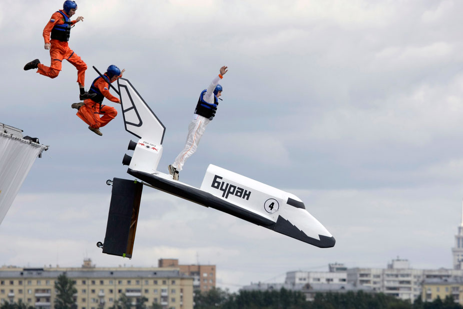 8月9日,莫斯科河畔舉辦一年一度的“墜落節(jié)”,表演者帶著自己設(shè)計(jì)制作的各種“飛行器”勇敢的從高空跳入水中。