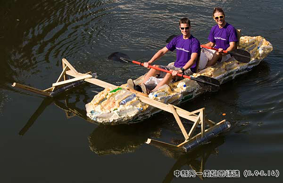 8月8日,來(lái)自新西蘭的木匠Campbell Holm和他的伙伴劃著一條由回收的塑料瓶制作的小船。點(diǎn)擊觀看詳細(xì)內(nèi)容