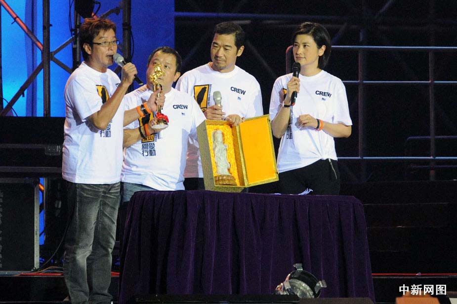 圖為譚詠麟現(xiàn)場捐出金馬獎。