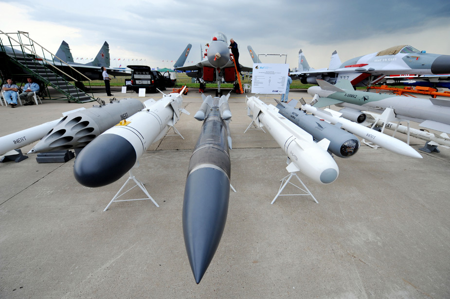 8月18日,2009莫斯科國際航空航天展(MAKS-2009)開幕。圖為展出的殲擊機(jī)和攜帶的導(dǎo)彈。