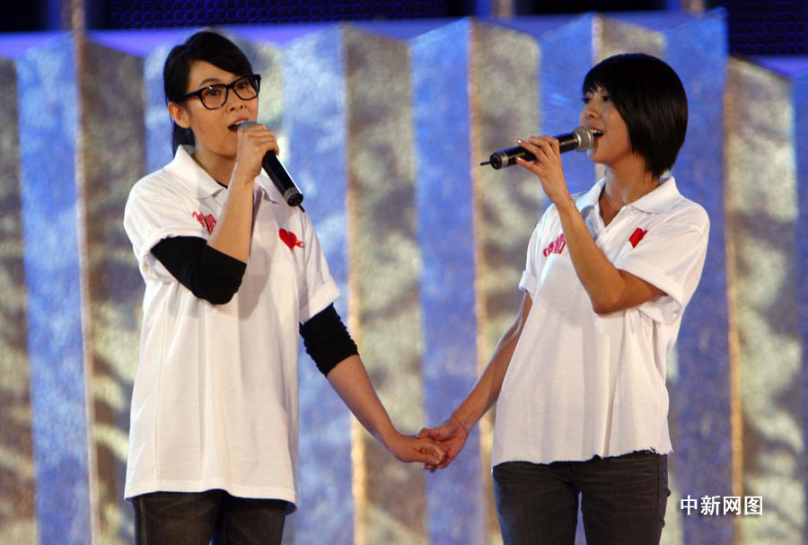 “跨越海峽的愛心”——大陸同胞援助臺灣“莫拉克”臺風(fēng)受災(zāi)同胞賑災(zāi)晚會在北京舉行。眾多文體界明星在現(xiàn)場亮相,獻(xiàn)出一片愛心。圖為劉若英和許茹蕓在晚會現(xiàn)場獻(xiàn)唱。中新社發(fā) 杜洋 攝