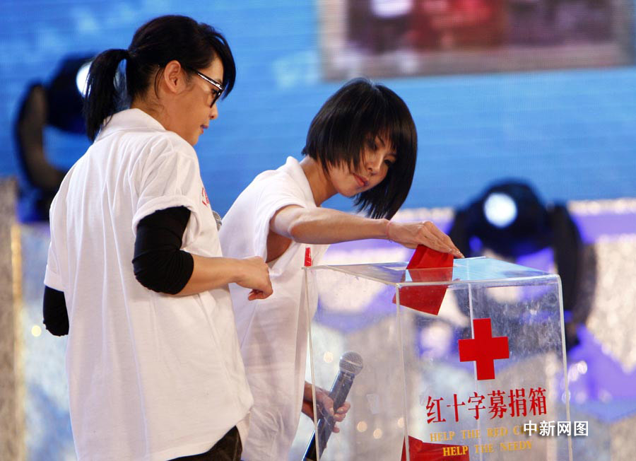 “跨越海峽的愛心”——大陸同胞援助臺(tái)灣“莫拉克”臺(tái)風(fēng)受災(zāi)同胞賑災(zāi)晚會(huì)在北京舉行。眾多文體界明星在現(xiàn)場(chǎng)亮相,獻(xiàn)出一片愛心。圖為劉若英、許茹蕓在晚會(huì)現(xiàn)場(chǎng)捐款。 中新社發(fā) 杜洋 攝