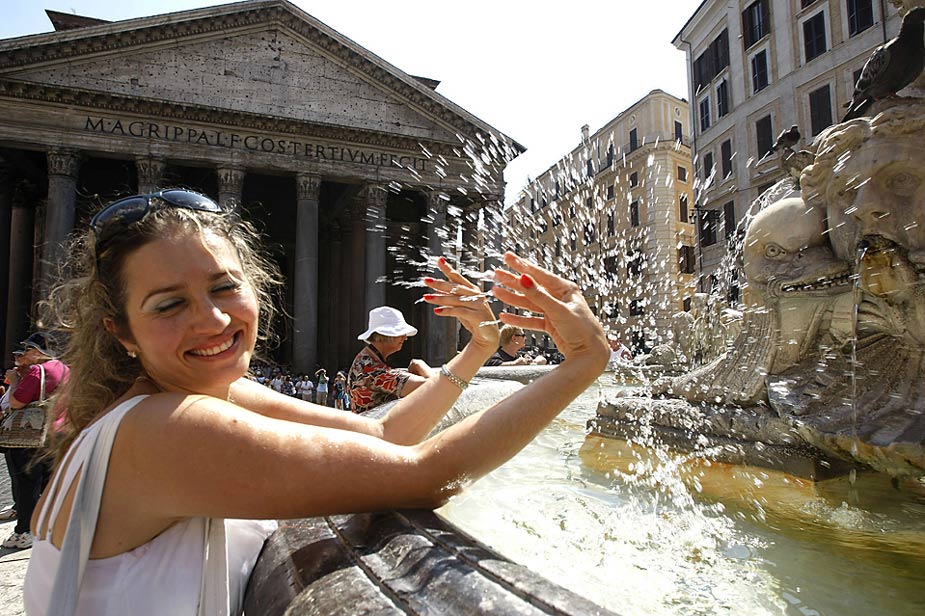 在意大利羅馬羅馬,一位美女在用噴泉里的水讓自己涼爽一下。