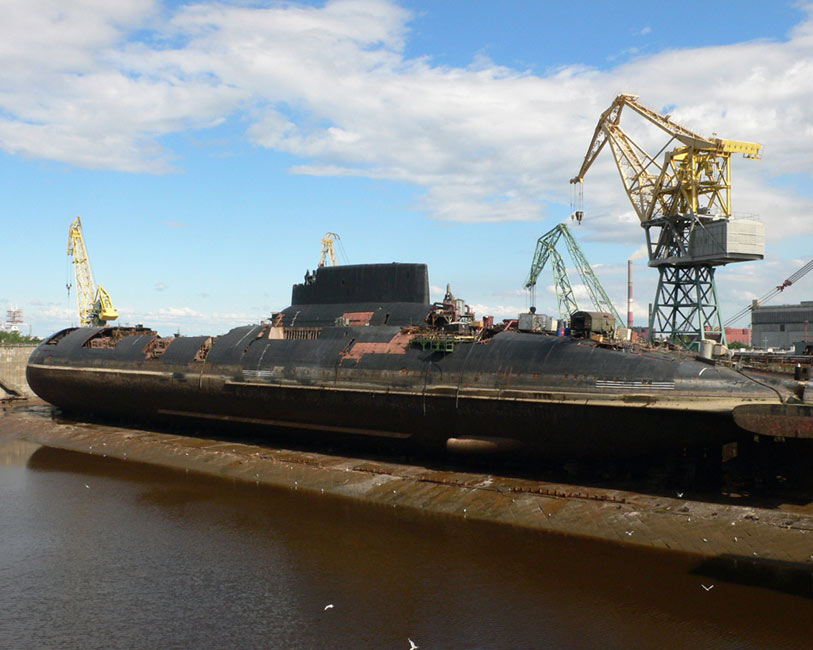 被拆解的核潛艇屬于臺風(fēng)級戰(zhàn)略核潛艇,編號TK13。2008年7月,該艇被運(yùn)抵俄羅斯北部北德文斯克的茲韋茲多奇卡(Zvezdochka)船廠。在那里退役并進(jìn)行拆解。目前正進(jìn)行艦體拆解工程,從圖片上看進(jìn)度已經(jīng)完成三分一左右。