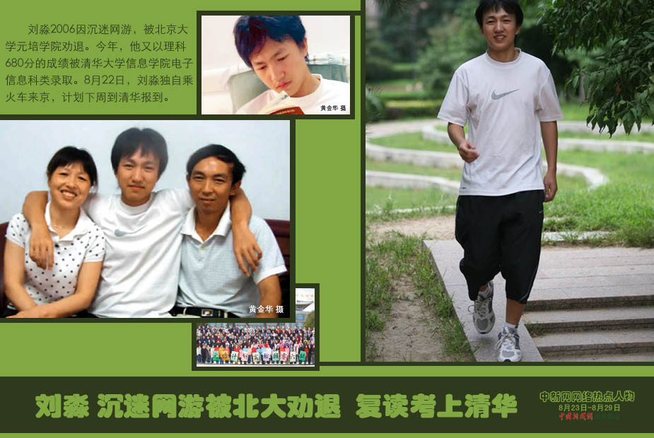 中新網(wǎng)本周熱點(diǎn)人物之——劉淼 劉淼2006因沉迷網(wǎng)游,被北京大學(xué)元培學(xué)院勸退。今年,他又以理科680分的成績(jī)被清華大學(xué)信息學(xué)院電子信息科類錄取。8月22日,劉淼獨(dú)自乘火車來(lái)京,計(jì)劃下周到清華報(bào)到。
