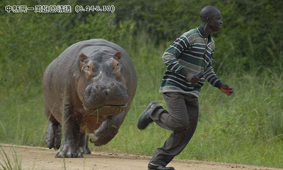 烏干達(dá)獵場一只大河馬在吃午餐時遭到一名看守人打擾,河馬怒了,突然沖了出來,看守人被嚇得落荒而逃。圖片來源:中國新聞網(wǎng)