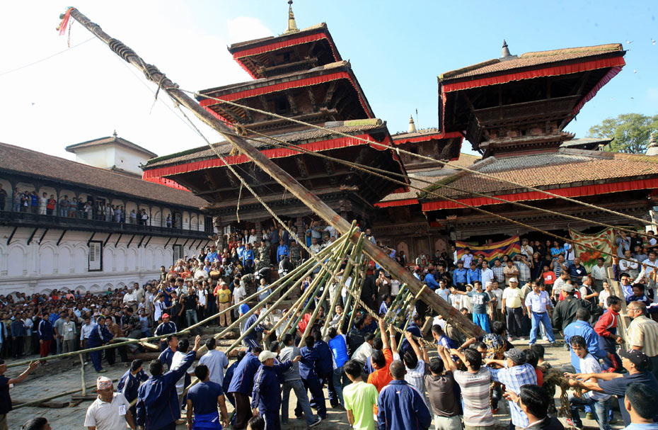 圖為節(jié)日當天舉行豎立因陀羅旗桿(經(jīng)過密宗儀式并修飾過的一棵樹干)的儀式。
